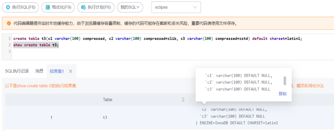 create table t3(c1 varchar(100) compressed, c2 varchar(100) compressed=zlib, c3 varchar(100) compressed=zstd) default charset=latin1;