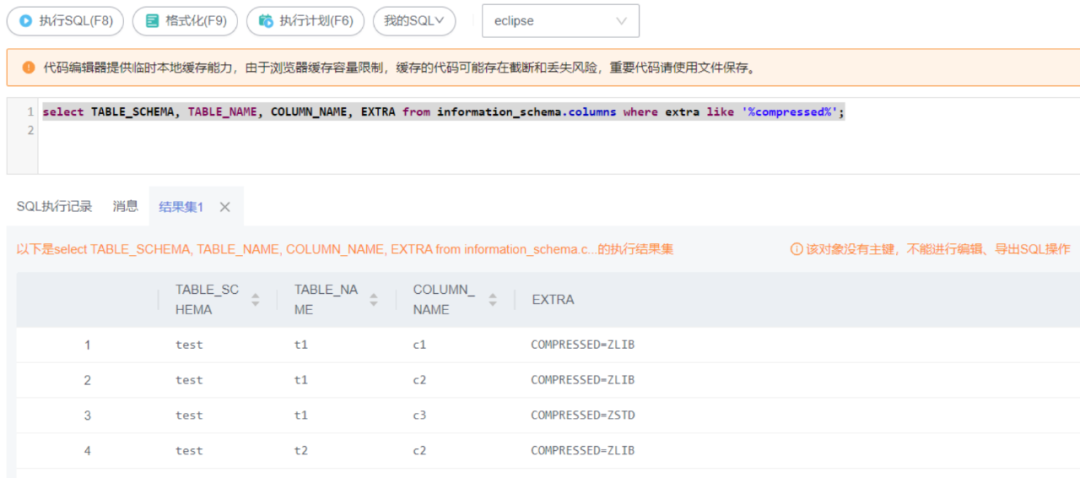 利用系统视图information_schema.columns查询压缩字段,执行如下SQL语句,