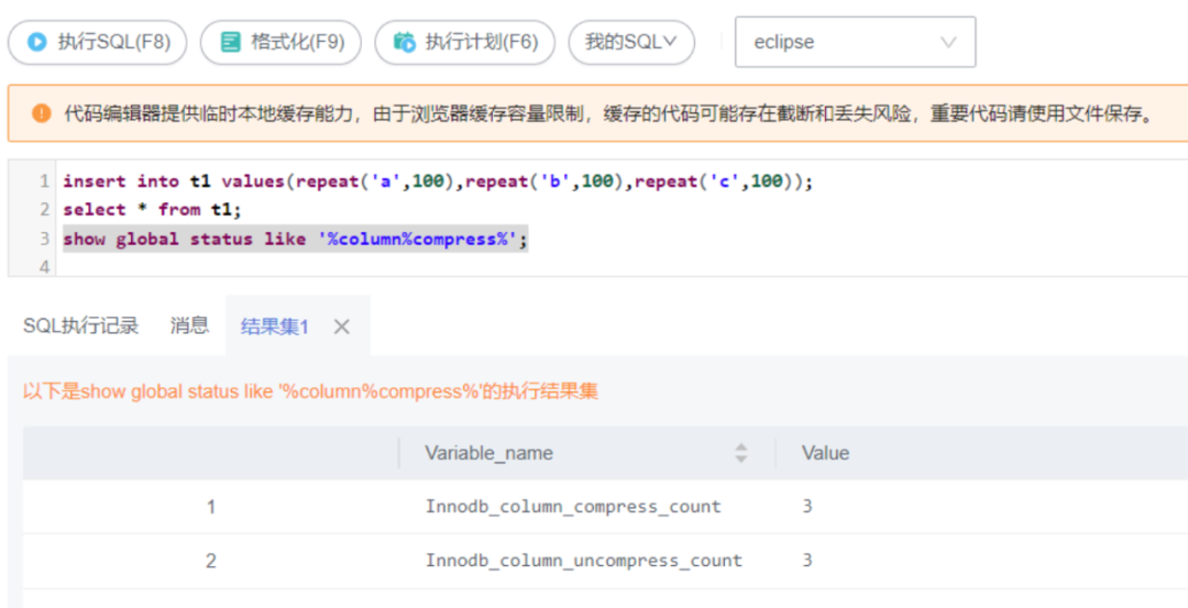 通过查询status信息,来确认字段压缩/解压缩接口的实际调用次数。例如,在将参数设置为rds_column_compression_threshold=20之后,对上述t1表进行插入数据以及查询数据操作,执行如下SQL语句,