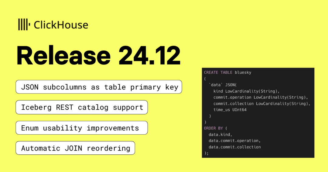 在本次发布中,ClickHouse 现已支持将 JSON 子列用作表的主键列: