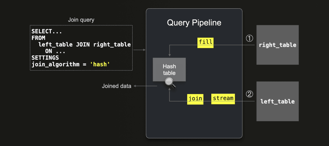 首先,我们回顾一下 ClickHouse 的最快 JOIN 算法(例如其默认的并行哈希 JOIN)的工作原理。这些算法依赖于内存中的哈希表,分为两个主要阶段:
