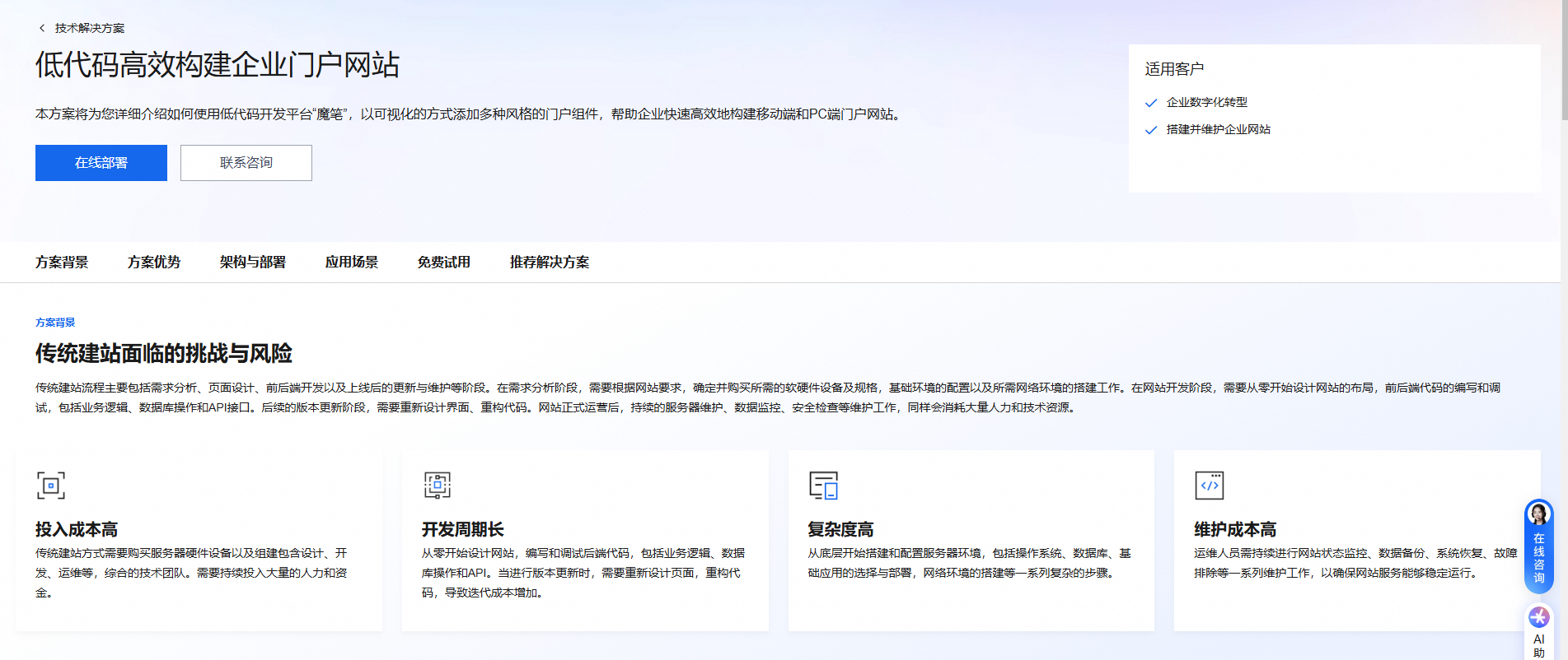 阿里云提供低代码平台,无需从底层环境开始搭建,可以直接使用平台的各种服务和工具,简化搭建过程,降低技术门槛和复杂度。通过拖拽式操作和丰富的预设模板,开发人员和业务人员可以快速完成网站搭建,缩短项目周期。一键适配PC和H5移动端,及时适应市场变化。