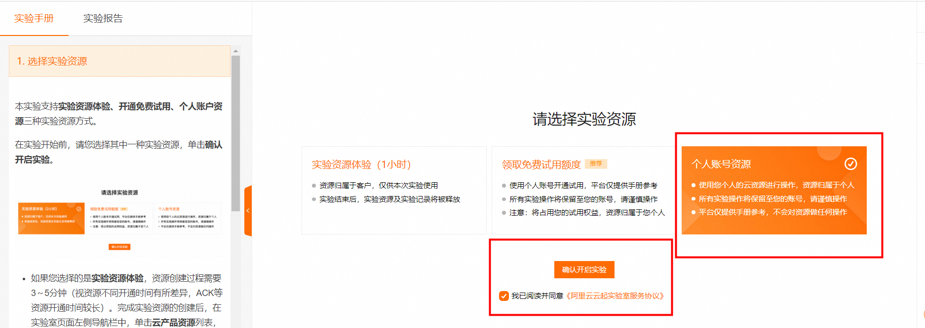 选择实验资源时,请您选择个人账户资源,使用任务一中开通的实例进行体验,单击确认开启实验。根据实验手册的指引完成实验。