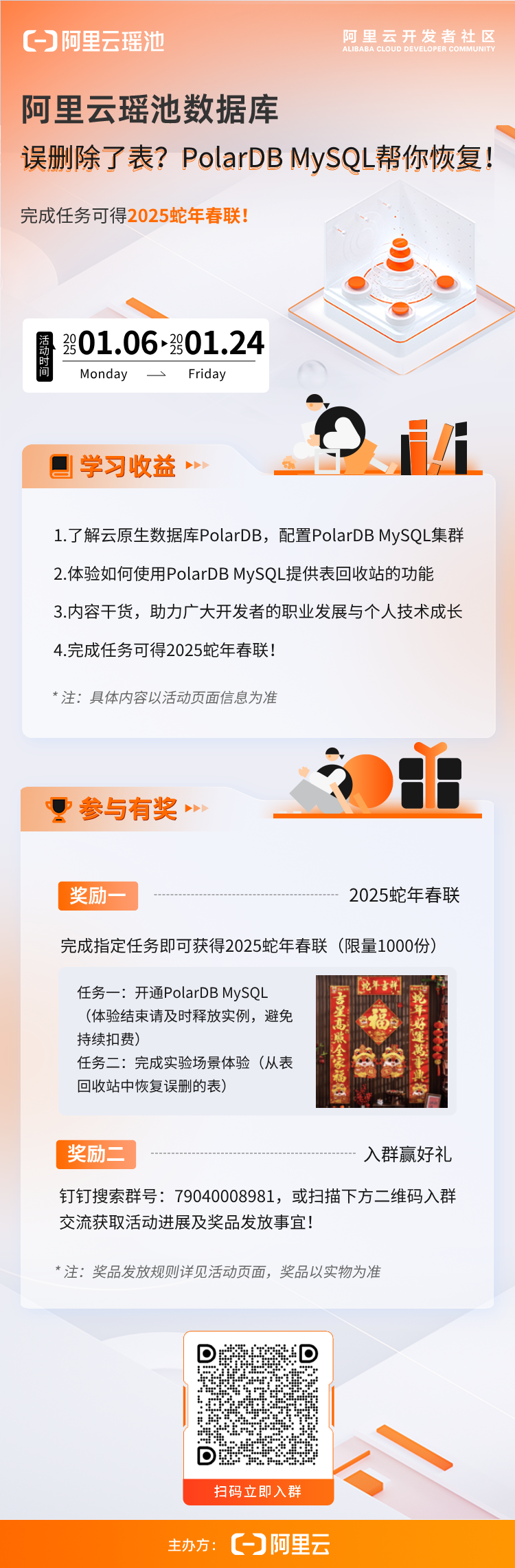 本次活动旨在帮助用户通过实际操作体验如何使用PolarDB MySQL提供表回收站的功能,从表回收站恢复误删的表,完成场景体验,即可获得2025蛇年春联。