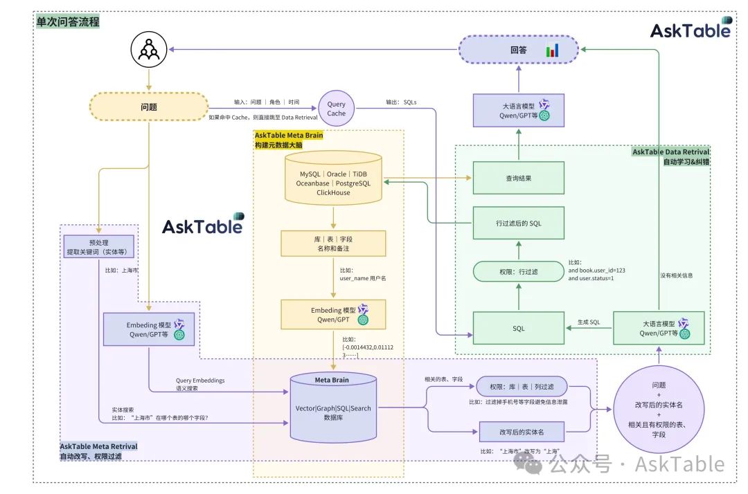 Data Retrieval 模块负责执行生成的 SQL 查询并获取数据。不同于传统数据库查询,AskTable 在这个过程中加入了智能学习与纠错机制。当查询结果与预期不符时,系统会利用 AI 模型对 SQL 进行动态调整或重写,以优化查询结果。这种动态纠错机制显著提高了复杂查询场景下的响应准确性。