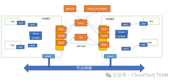 BGP Route Reflector(RR),大规模部署时使用,摒弃所有节点互联的 mesh 模式,通过一个或者多个BGP Route Reflector来完成集中式的路由分发。