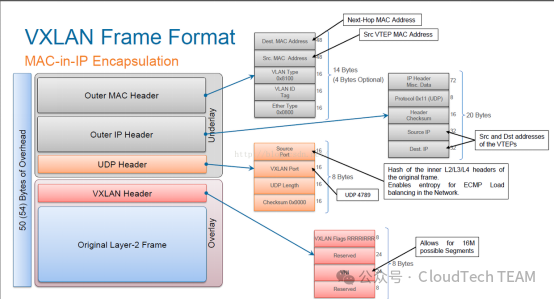 Vxlan(virtual Extensible LAN)虚拟可扩展局域网,是一种Overlay技术,将原始的2层以太网帧进行UDP封装(Mac in UDP),同时由于Vxlan更好的扩展性和更大的局域网划分可以很好解决在大型网络环境中Vlan 数量不够的问题,同时Vxlan的特性也更好可以与租户隔离绑定,实现网络租户管理、隔离等功能。我们可以简单看一下Vxlan的封装以及通讯过程,这里拿虚拟机举例