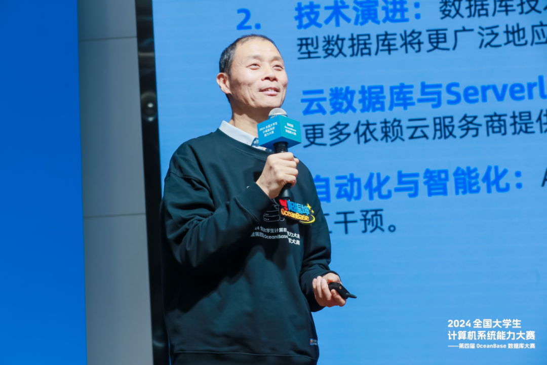 1 月 12 日,2024 第四届 OceanBase 数据库大赛决赛在北京举办。颁奖典礼上,阳老师为同学们带来了一场「爱上数据库」主题公开课,分享了自己的成长故事和对数据库行业的判断与思考。