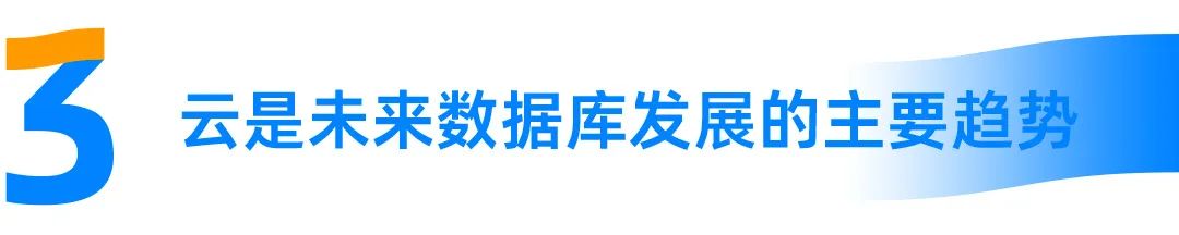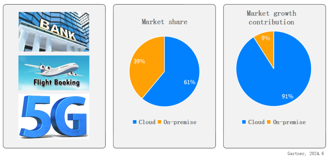 今天,云在数据库市场里占据主流。左边的图里,蓝色部分云数据库市场份额,黄色部分是线下部署的市场份额。现在,云已经占了超过 60%。从右边的图可以看出,数据库每年的市场增量有 90% 在云上,这意味着随着时间的推移,云数据库的占比会越来越大。