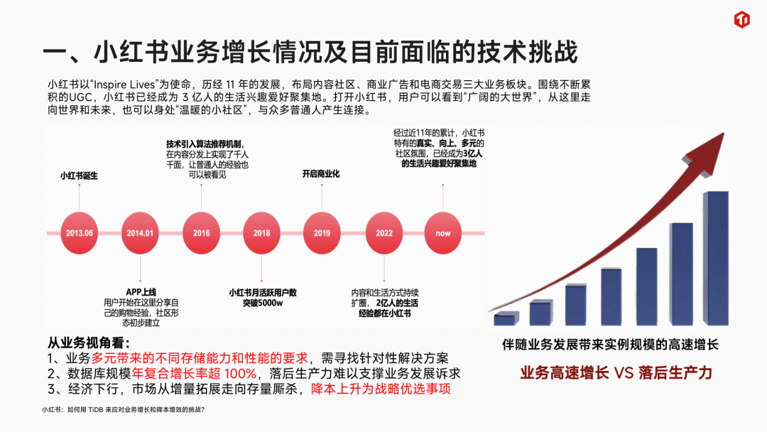 在当今数字化时代,社交媒体平台如小红书在全球范围内迅速崛起,积累了庞大的用户群体和海量的数据。小红书以其独特的内容社区、商业广告和电商交易业务板块,成为了 3 亿人生活兴趣爱好的聚集地。然而,随着业务的高速增长,小红书面临着诸多技术挑战,尤其是在数据库管理方面。如何选择合适的数据库技术来应对数据规模飙升带来的数据存储、处理和管理需求,以及实现降本增效的目标,成为了小红书技术团队的关键任务。本文将深入探讨小红书在这一过程中如何利用 TiDB 来应对这些挑战,分享其实践经验和成果。