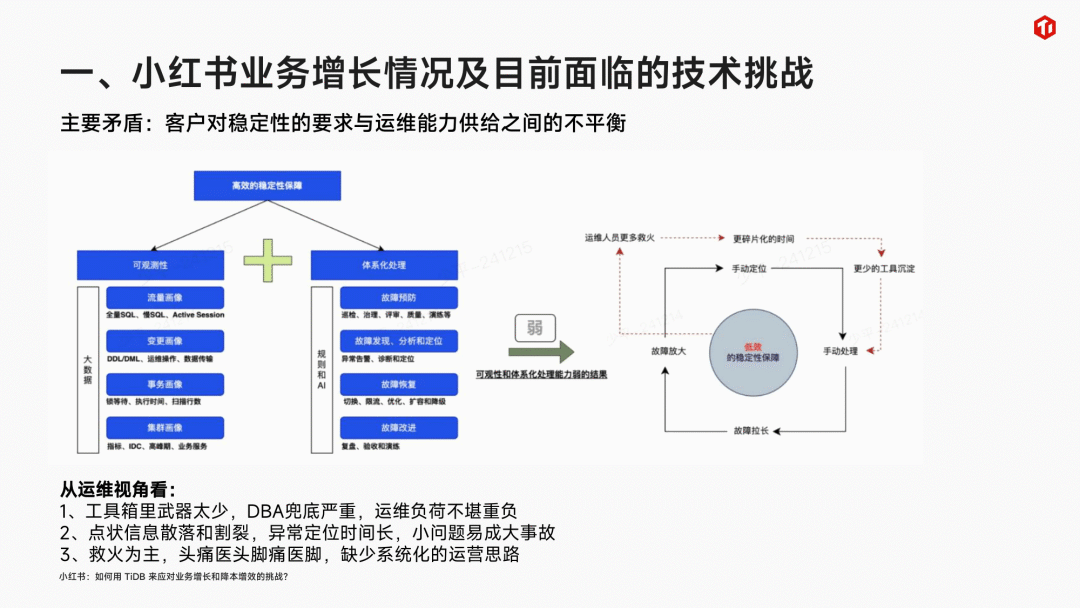 从运维视角来看,小红书面临着一系列严峻的问题。首先,运维工具相对匮乏,DBA兜底现象严重,导致运维负荷不堪重负。在处理数据库故障和问题时,缺乏有效的自动化工具和系统,大部分工作需要人工手动完成,这不仅效率低下,而且容易出错。