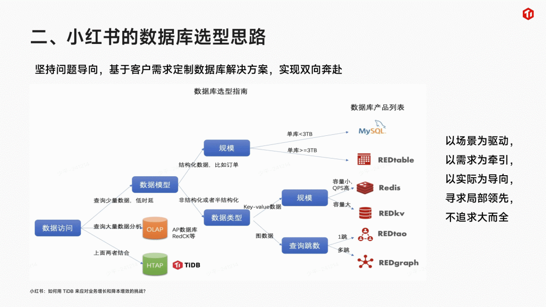 在数据库选型过程中,小红书以场景为驱动,以需求为牵引,以实际为导向,不追求大而全的数据库解决方案,而是寻求在各个特定场景下的局部领先。例如,在报表大盘业务中,需要处理复杂 SQL 查询(包括各种函数、JSON、子查询、JOIN 关联等),且涉及大量数据分析(OLAP),TiDB 能够凭借其强大的查询处理能力和对复杂数据类型的支持,满足这一业务场景的需求。