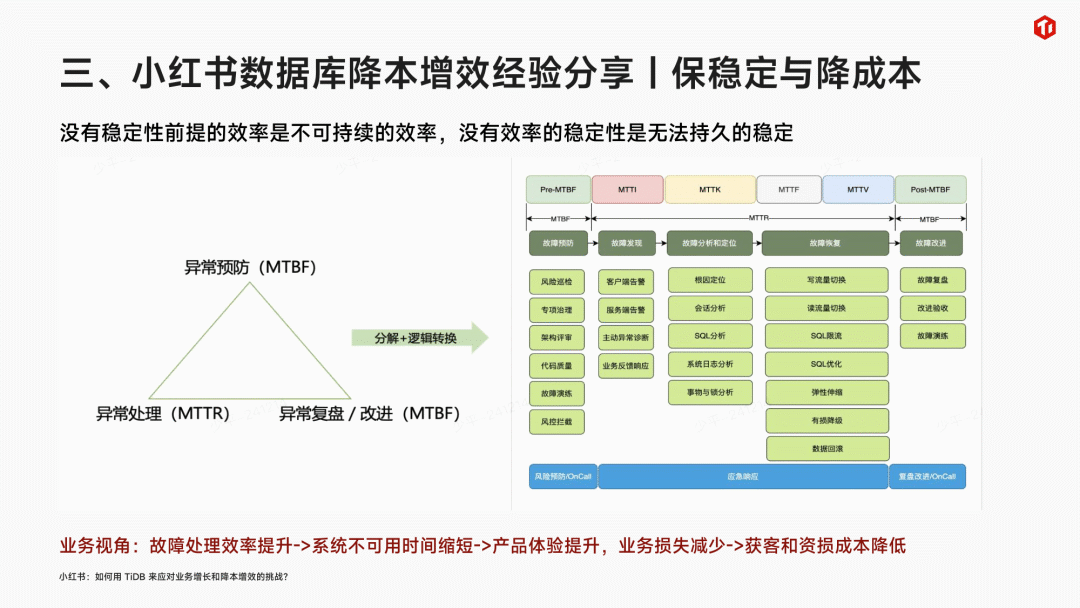 小红书高度重视故障处理效率的提升,将其视为降低成本的关键环节之一。从业务视角来看,故障处理效率的提高能够缩短系统不可用时间,进而提升产品体验,减少业务损失,降低获客和资损成本。