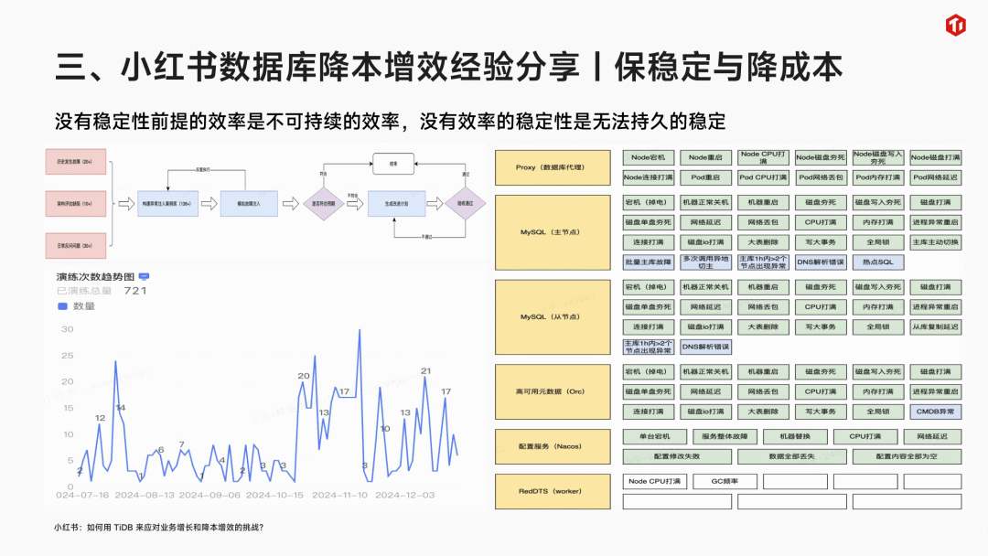 在实际操作中,小红书采取了一系列措施。首先,建立了完善的故障演练机制,通过模拟各种可能出现的故障场景,如批量主库故障、DNS 解析错误、CMDB 异常、全局锁、写大事务、大表删除、磁盘 I/O 打满、连接打满、进程异常重启、内存打满、CPU 打满、网络丢包、网络延迟、磁盘单盘夯死等,对系统的稳定性和恢复能力进行全面测试和验证。通过不断地进行故障演练,能够及时发现系统中的潜在问题和薄弱环节,并针对性地进行改进和优化。