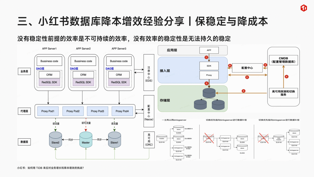 在离线服务方面,主要以数仓的抽数集群为主(OLAP 为主),TiDB 也能够提供高效的数据抽取和分析能力,满足数据仓库的建设和运营需求。通过这种场景驱动和局部领先的选型策略,小红书能够充分发挥不同数据库的优势,构建高效、稳定的数据库架构体系。