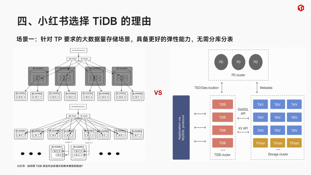 而对于大数据量存储且对弹性能力有较高要求的场景,尤其是在 TP(事务处理)要求较高并发处理的情况下,TiDB 成为了重要的选择之一。TiDB 能够很好地应对小红书数据规模飙升带来的数据存储和处理压力,无需进行复杂的分库分表操作,降低了架构的复杂性和运维成本。