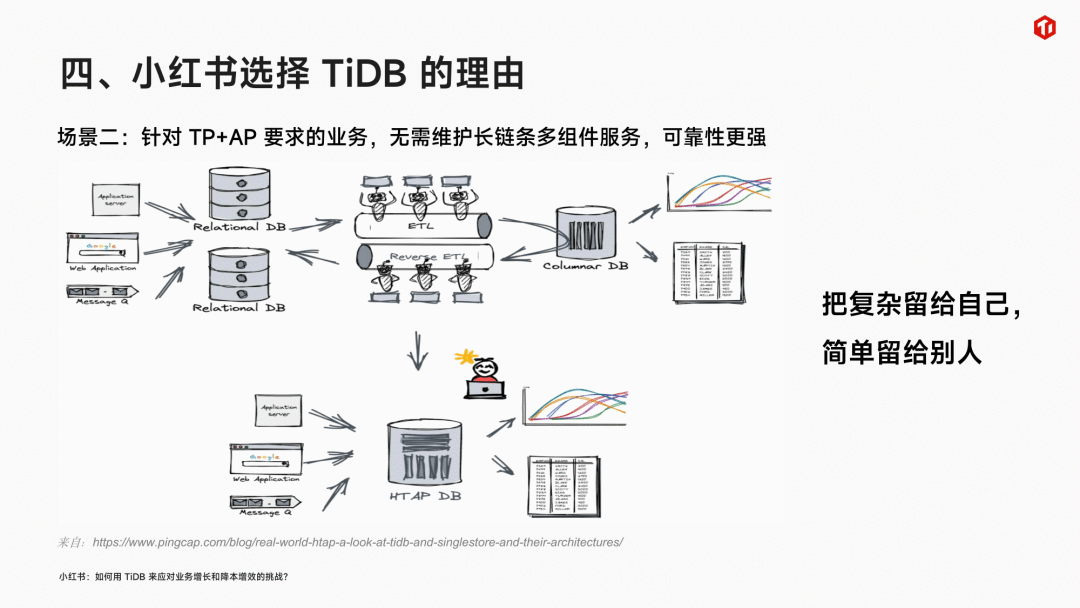 对于 TP + AP 要求的业务,TiDB 无需维护长链条多组件服务,简化了系统架构,提高了可靠性。在小红书的业务中,如报表大盘和风控审核等业务,既需要处理大量的事务性操作(TP),又需要进行实时的数据分析(AP)。
