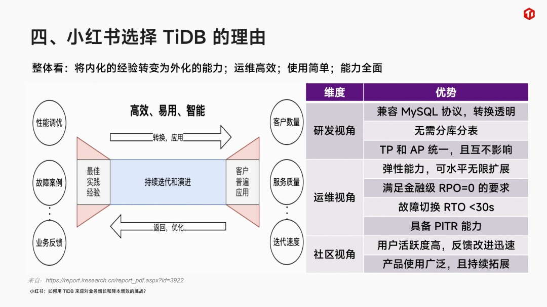TiDB 的产品使用广泛且持续拓展,这表明其在市场上得到了广泛的认可和应用。小红书选择 TiDB,也能够借助其良好的市场口碑和广泛的用户基础,降低技术选型的风险,确保数据库技术的先进性和可靠性。