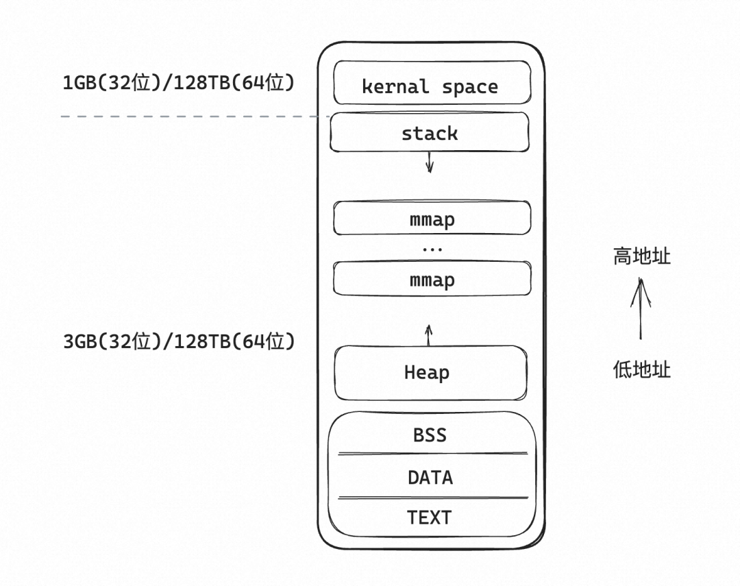 进程虚拟地址空间以内核空间为终止,内核地址空间占用1GB(32位系统),仅在内核态下可以访问,用户态直接访问会导致Segmentation Fault。剩下的3GB是用户态的空间,每个用户进程独占所有用户态空间