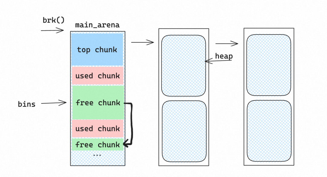 top chunk是arena顶部的一段空闲空间,在主分配区中top chunk顶部是brk指针。top chunk不属于任何bins,当所有的Bin都无法满足分配需求时,会从top chunk中分割分配空间,top chunk底部收缩;