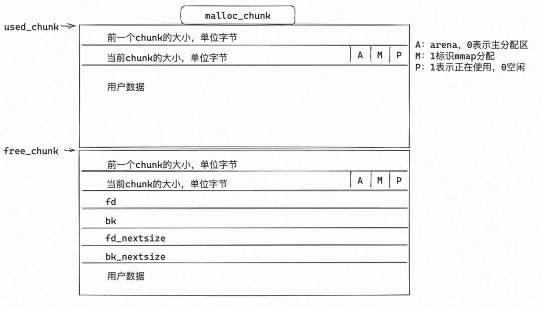 正在使用的chunk和空闲的chunk数据结构有一些不同。ptmalloc可以通过当前chunk大小和前一个chunk的大小,找到与当前chunk地址相邻的前后两个chunk的地址。