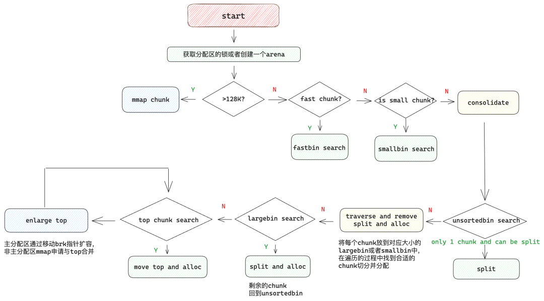 如果申请大小超过MMAP阈值最小值,那么就直接使用mmap分配内存,否则从内存池中申请,内存池的分配策略是先从小的内存链表中以较低的时间复杂度进行查找,依次到更加耗时的系统调用分配。具体分配内存策略如下: