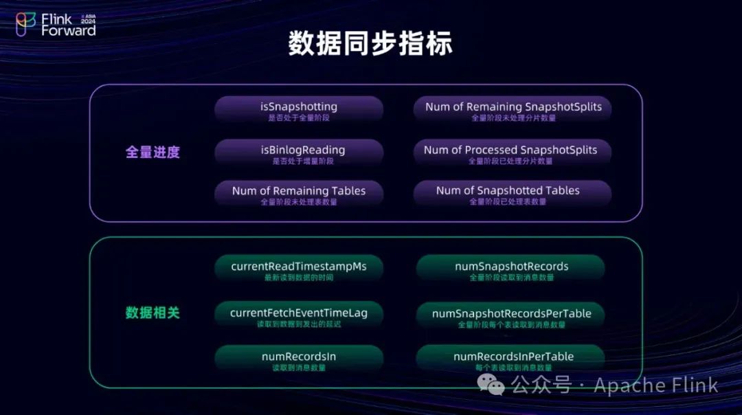 我们提供了指标用于判断当前是处于全量同步阶段还是增量同步阶段。同时,我们还根据表提供了全量阶段已处理分片数量、未处理分片数量、已处理表数量以及未处理表数量等具体信息,以便用户清晰地查看同步进度。