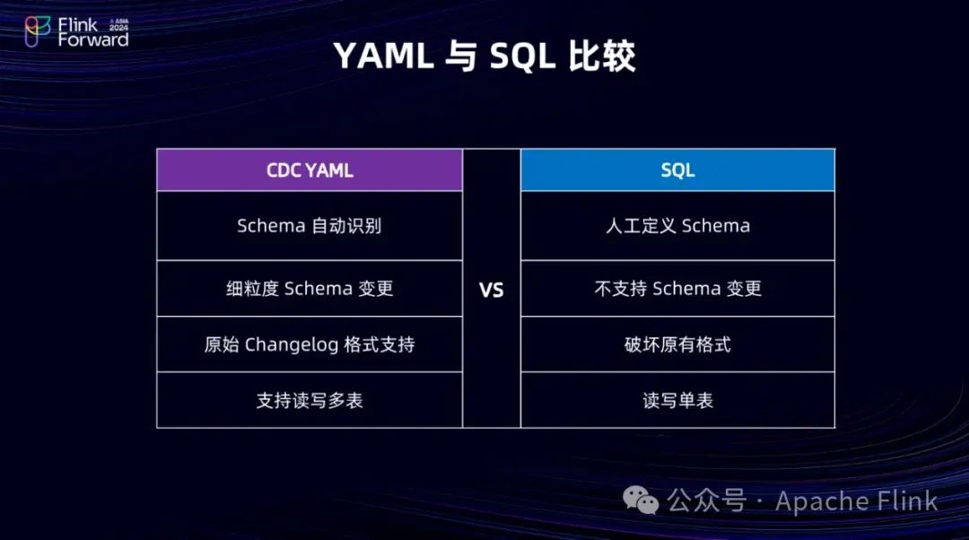 相较于 SQL 作业开发,我们对 CDC YAML 开发方式进行了简单的对比分析。传统的 SQL 作业开发无法支持 Schema 变更,需要事先定义 Schema,且 Schema 在作业启动后无法变更,这限制了其灵活性。此外,由于 SQL 依赖于 RowData 传递数据,这会破坏 Binlog 的原始格式。例如,将一条 Update 消息拆分为 Update Before 和 Update After 两条消息,这导致 SQL 作业无法支持同步原始 Binlog 的场景。另外,SQL 方式通常仅支持单表的读写操作。