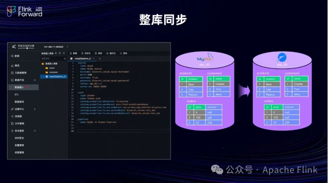 最简单的应用场景是整库同步。例如,在 MySQL 中存在 Products、Customers 和 Orders 三张表,我们需要将这些表同步到 Paimon 中,以便后续进行高效的查询和分析。为实现这一功能,我们只需简单地采用如图的 YAML 作业进行同步,只需定义好 Source 端 MySQL 的相关内容,明确需要同步的表,然后配置 Sink 端的连接信息,即可完成整库同步的工作。