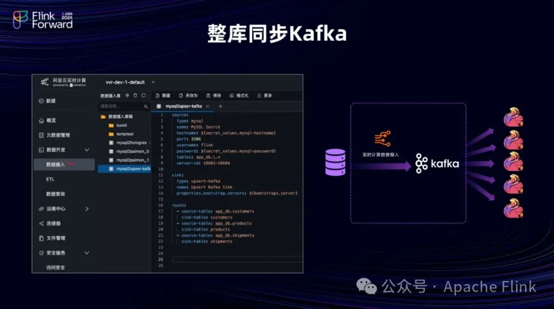 接下来,我们要讨论的是整库同步到 Kafka 的功能。实际应用中,当多个作业依赖于 MySQL 的同一张表时,频繁地建立数据库连接可能会导致数据库压力过大。整库同步后的 Upset Kafka 表可以被当作原来的 MySQL 表来读取,从而减轻系统压力。