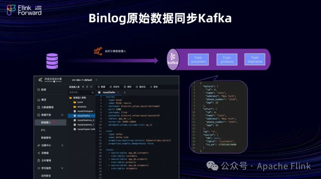 除了将整个表的数据完全同步到 Upset Kafka 之外,还有一种场景是用户可能需要完整的表变更信息,即 Binlog 的原始内容。这个功能在 CTAS/CDAS 中无法支持,但我们在 CDC YAML 中进行了相应的支持。