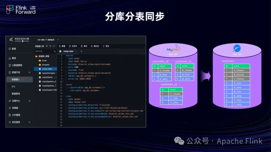 为了实现这样的功能,我们需要在 Route 模块中设置多对一的表映射关系。例如,我将 app_db 下所有以 customers 开头的三张表都写入到 Paimon 的 Customers 这一张表中。因此,在整个同步过程中,这三张表的数据都会同步到这个同一张表中,从而完成分库分表同步的功能。
