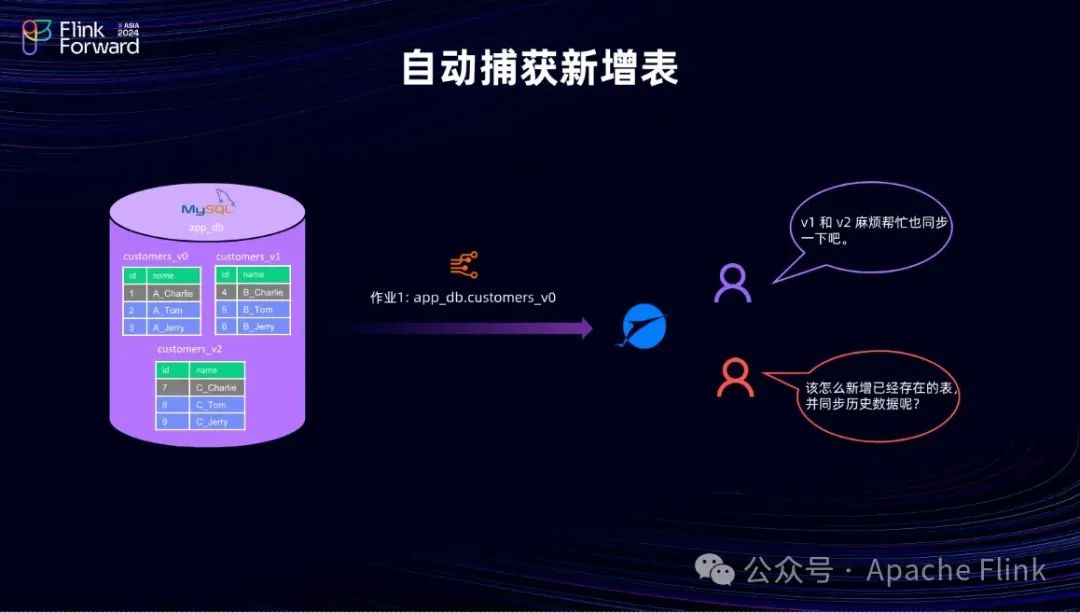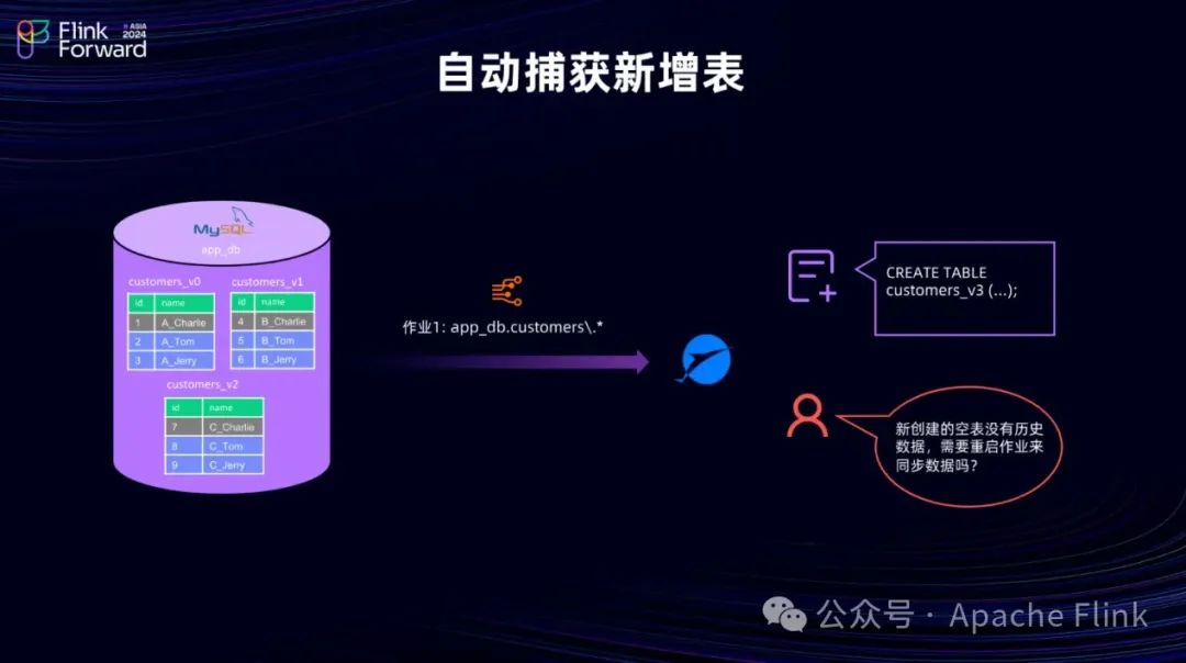 此外,还有一种场景是,在同步作业启动时,已经能够正常同步具有特定前缀(如Customers)的表,例如V0、V1、V2。然而,在作业运行过程中,上游可能会创建一个符合该前缀的新表(如V3),且这张新表没有历史数据。针对这种新表,我们应该如何确保其能够被正确同步呢?