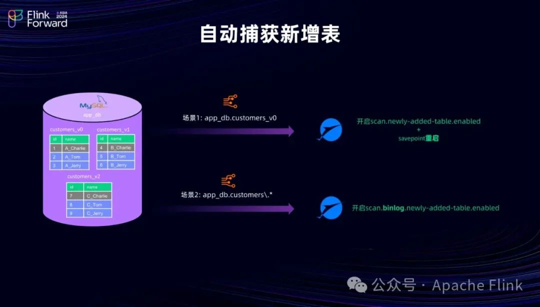 对于第一种场景,在需要同步已有表的历史数据时,我们需要对 Source 开启scan.newly-added-table.enable配置,并从 Savepoint 重启重新捕获那些需要同步历史数据的表。