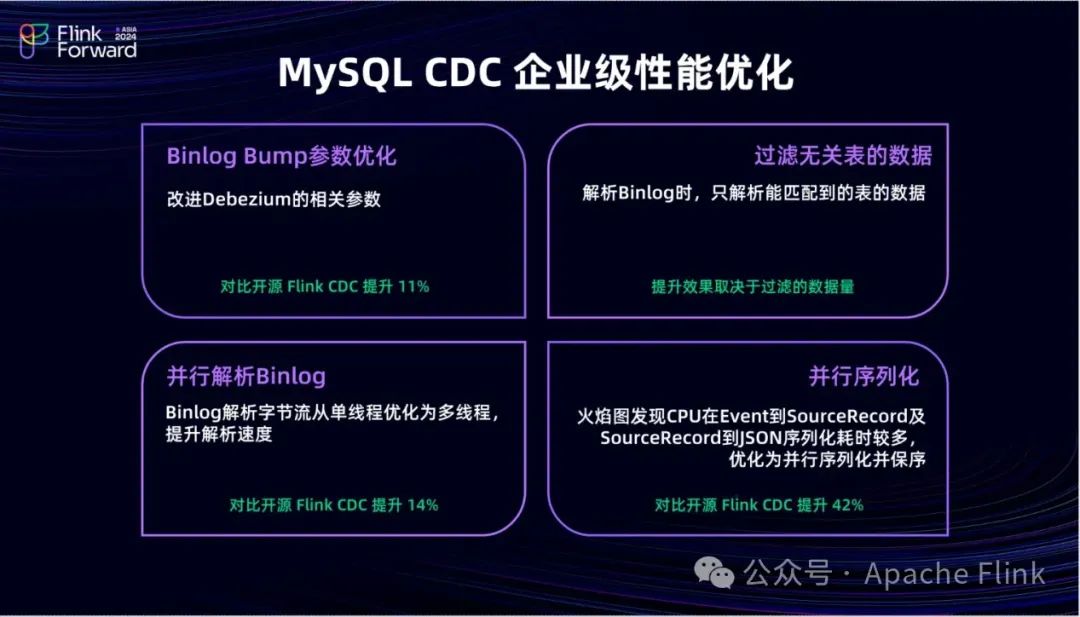 第三,我们实现了并行解析 Binlog 的操作。与开源版本仅支持单线程解析不同,我们在企业级 MySQL CDC 中将其优化为多线程解析。这一改变使得解析效率得到了显著提升,与单线程相比,效率提升了约 14%。