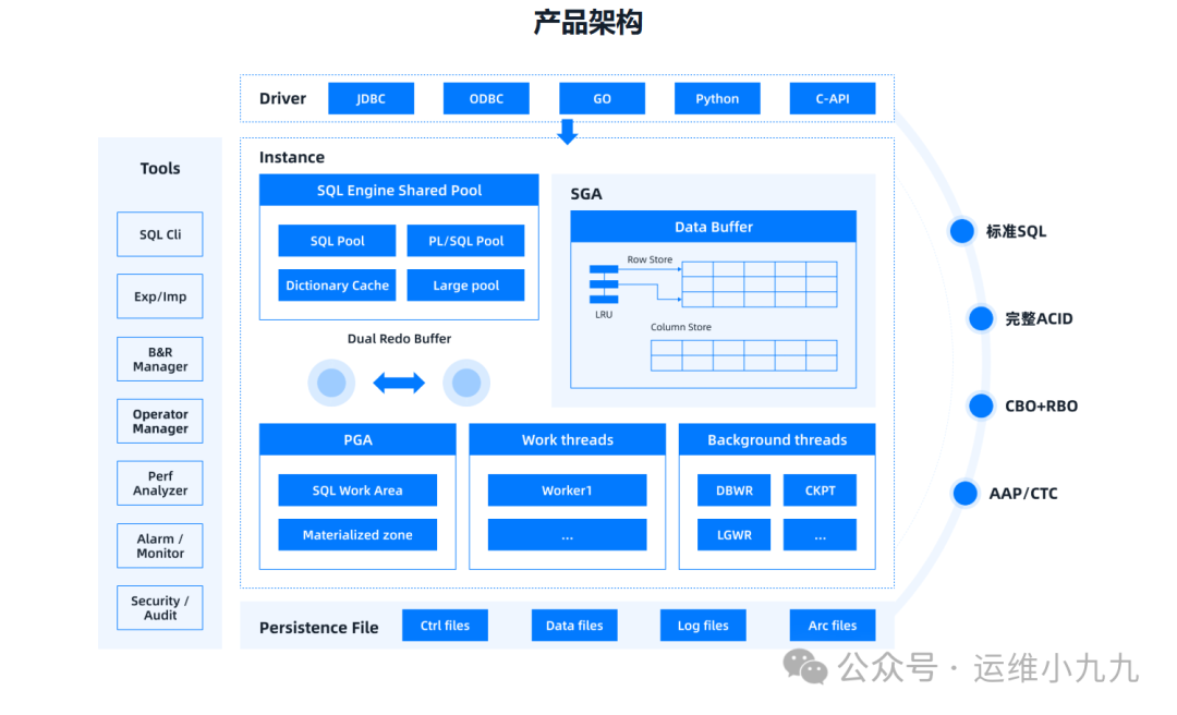 崖山数据库管理系统采用先进内核架构,高效地支持众核计算、大内存、新存储介质和网络通信框架,软件层面采用并行和向量引擎、异步并行框架、OCC动态事务调度算法、Raft协议、有界理论等技术方案和算法,通过多形态的产品架构和全面的基础设施支持能力,满足企业级核心应用对高兼容、高性能、高扩展、高可用等全生命周期数据管理诉求。