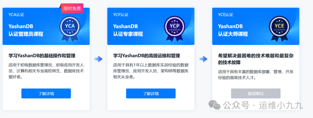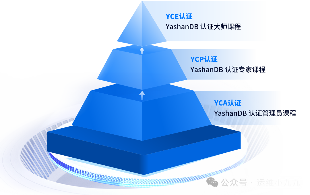 YashanDB认证体系是崖山数据库系统团队面向数据库相关技术人员推出的多样化能力认证体系,涵盖YCA(YashanDB认证管理员)、YCP(YashanDB认证专家)、YCE(YashanDB认证大师)三大认证课程。