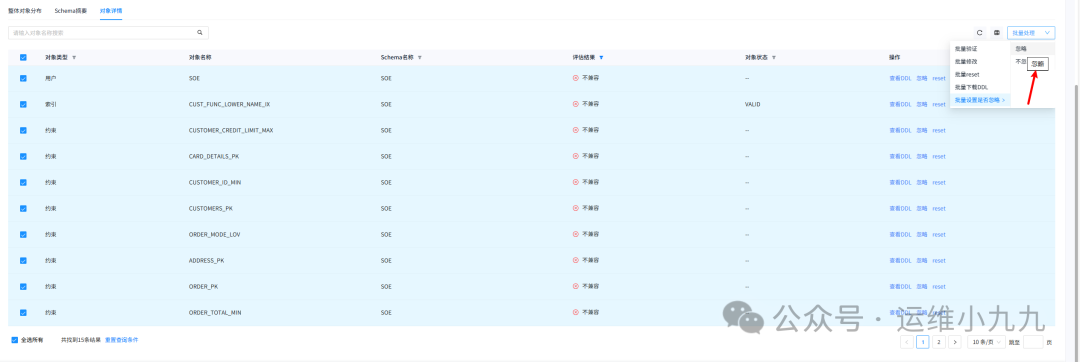 评估这里可能会出现兼容占比不到100%的情况,这将无法进行下一步,必须手动调整,点击下方的对象详情,针对那些评估结果为不兼容的对象,选择如何去修改,图中自有奥妙,自己瞅瞅吧。
