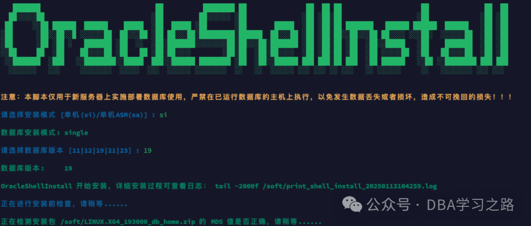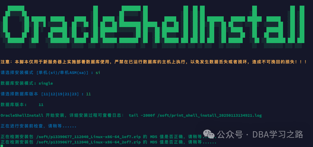 OracleShellInstall 开始安装,详细安装过程可查看日志: tail -2000f soft/print_shell_install_20250113134921.log
