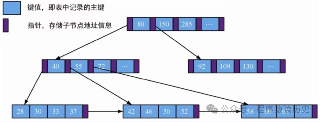 B树是将数据按照一定的顺序存储在树节点中,每个节点包含一定数量的关键字(key)和指针(pointer)。key 按照从小到大的顺序排列,pointer 指向包含相应关键字的子节点,这保证树的高度较低,在查询时能够减少磁盘IO,快速定位到目标数据,如下图所示。