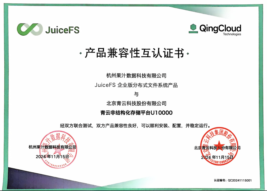 近日,青云科技自主研发的 QingStor U10000 非结构化数据存储系统成功完成了与高性能开源分布式文件系统 JuiceFS 的兼容性认证。这一认证标志着青云存储 QingStor U10000 与 JuiceFS 能够紧密协作,为 AI 训练场景提供高效、可靠的数据存储解决方案,共同推动人工智能技术的快速发展。