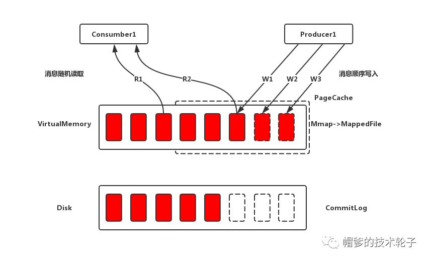 对于文件的顺序读写操作来说,读和写的区域都在OS的PageCache内,此时读写性能接近于内存。RocketMQ的大致做法是,将数据文件映射到OS的虚拟内存中(通过JDK NIO的MappedByteBuffer),写消息的时候首先写入PageCache,并通过异步刷盘的方式将消息批量的做持久化(同时也支持同步刷盘);订阅消费消息时(对CommitLog操作是随机读取),由于PageCache的局部性热点原理且整体情况下还是从旧到新的有序读,因此大部分情况下消息还是可以直接从Page Cache(cache hit)中读取,不会产生太多的缺页(Page Fault)中断而从磁盘读取
