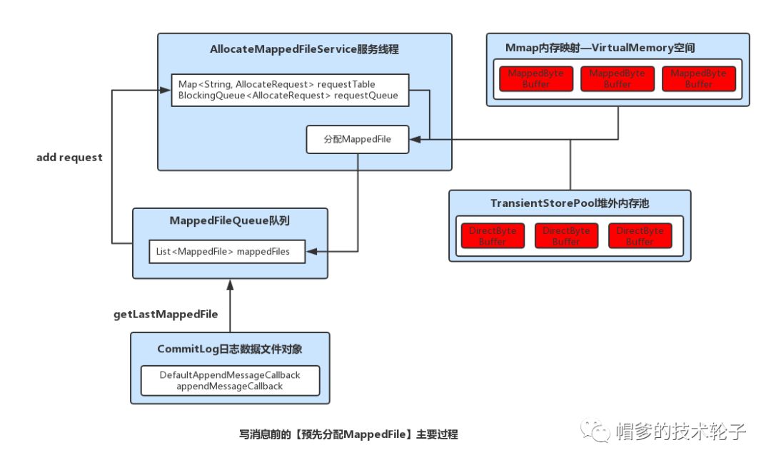在消息写入过程中(调用CommitLog的putMessage()方法),CommitLog会先从MappedFileQueue队列中获取一个 MappedFile,如果没有就新建一个;这里,MappedFile的创建过程是将构建好的一个AllocateRequest请求(具体做法是,将下一个文件的路径、下下个文件的路径、文件大小为参数封装为AllocateRequest对象)添加至队列中,后台运行的AllocateMappedFileService服务线程(在Broker启动时,该线程就会创建并运行),会不停地run,只要请求队列里存在请求,就会去执行MappedFile映射文件的创建和预分配工作,分配的时候有两种策略,一种是使用Mmap的方式来构建MappedFile实例,另外一种是从TransientStorePool堆外内存池中获取相应的DirectByteBuffer来构建MappedFile(ps:具体采用哪种策略,也与刷盘的方式有关)。并且,在创建分配完下个MappedFile后,还会将下下个MappedFile预先创建并保存至请求队列中等待下次获取时直接返回。RocketMQ中预分配MappedFile的设计非常巧妙,下次获取时候直接返回就可以不用等待MappedFile创建分配所产生的时间延迟