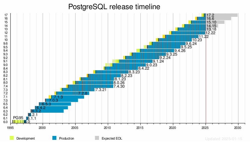 - 社区正式将项目名称从 POSTGRES 更改为 PostgreSQL,以反映对 SQL 标准的支持。此时的版本称为 PostgreSQL 6.0。