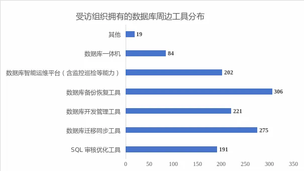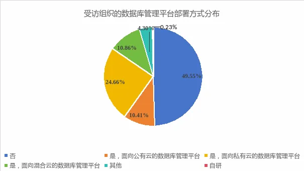 近半数组织未使用数据库管理平台,已使用的组织中有近一半选择面向私有云的数据库管理平台。据统计,49.55%的组织没有使用数据库管理平台;24.66%使用面向私有云的数据库管理平台;10.86%使用面向混合云的数据库管理平台;10.41%使用面向公有云的数据库管理平台;使用其他数据库管理平台以及自研的分别占比4.3%和0.23%。