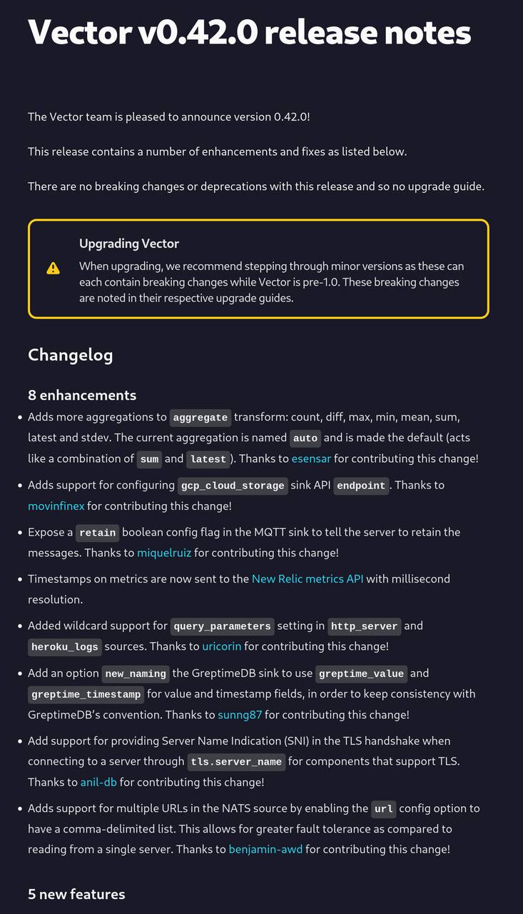 在 Changelog 方面,2024 年 Vector 项目又引入一个新的机制要求开发者编写变更描述,该机制来自工具 towncrier