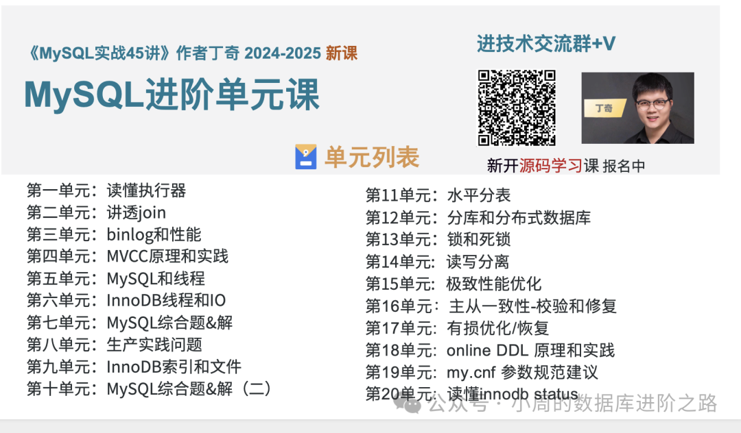 课程作者:丁奇,15年MySQL内核开发经验前阿里云数据库内核团队负责人、P9;前腾讯云数据库团队负责人、13级;专栏《MySQL实战45讲》