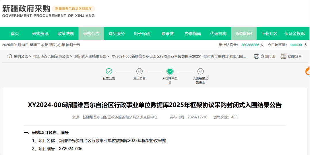 新疆维吾尔自治区行政事业单位数据库2025年框架协议采购