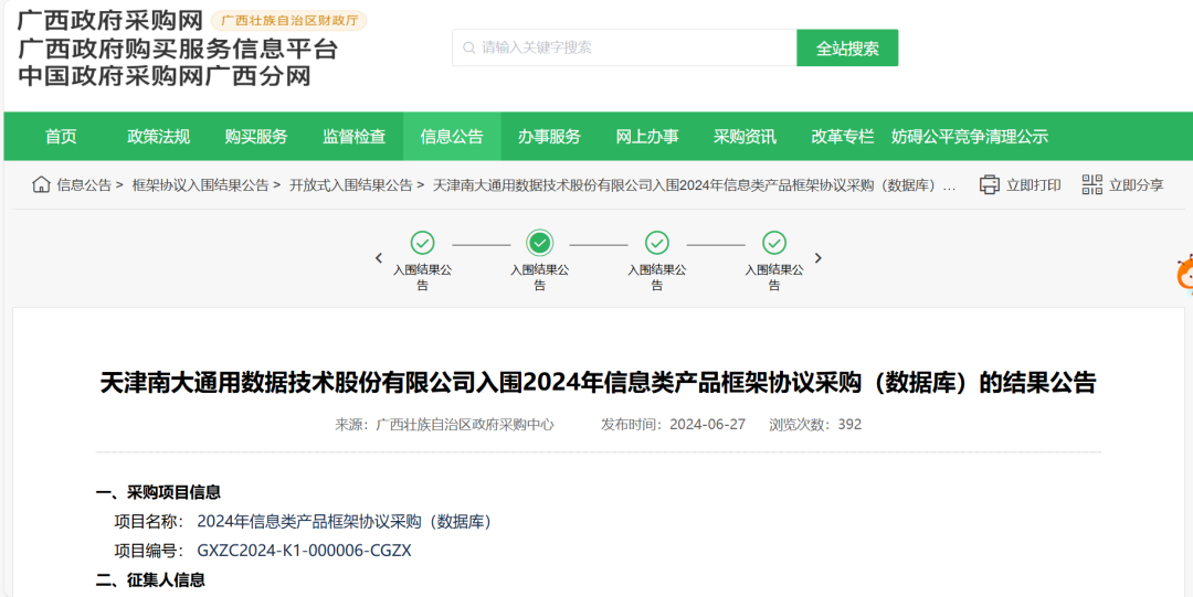 南大通用GBase 8s数据库入围广西壮族自治区2024年信息类产品框架协议采购(数据库)集中式数据库标项。