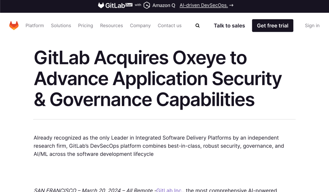 GitLab 收购 Oxeye:https://about.gitlab.com/press/releases/2024-03-20-gitlab-acquires-oxeye-to-advance-application-security-and-governance-capabilities